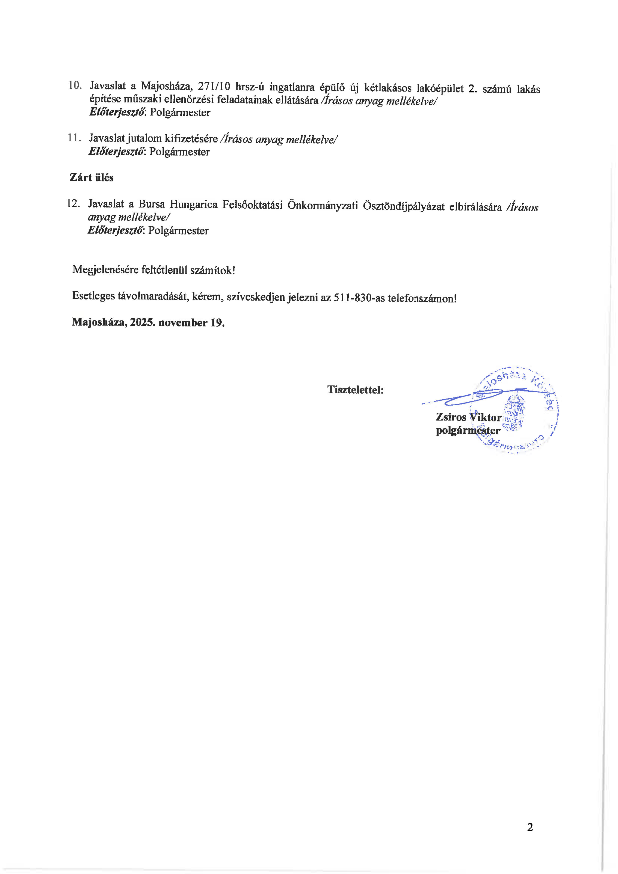 - 10. napirendi javaslat a Majosháza, 271/10 hrsz-ú ingatlanra épülő új kétlakásos lakóépület 2. számú lakás építése műszaki ellenőrzési feladatainak ellátására