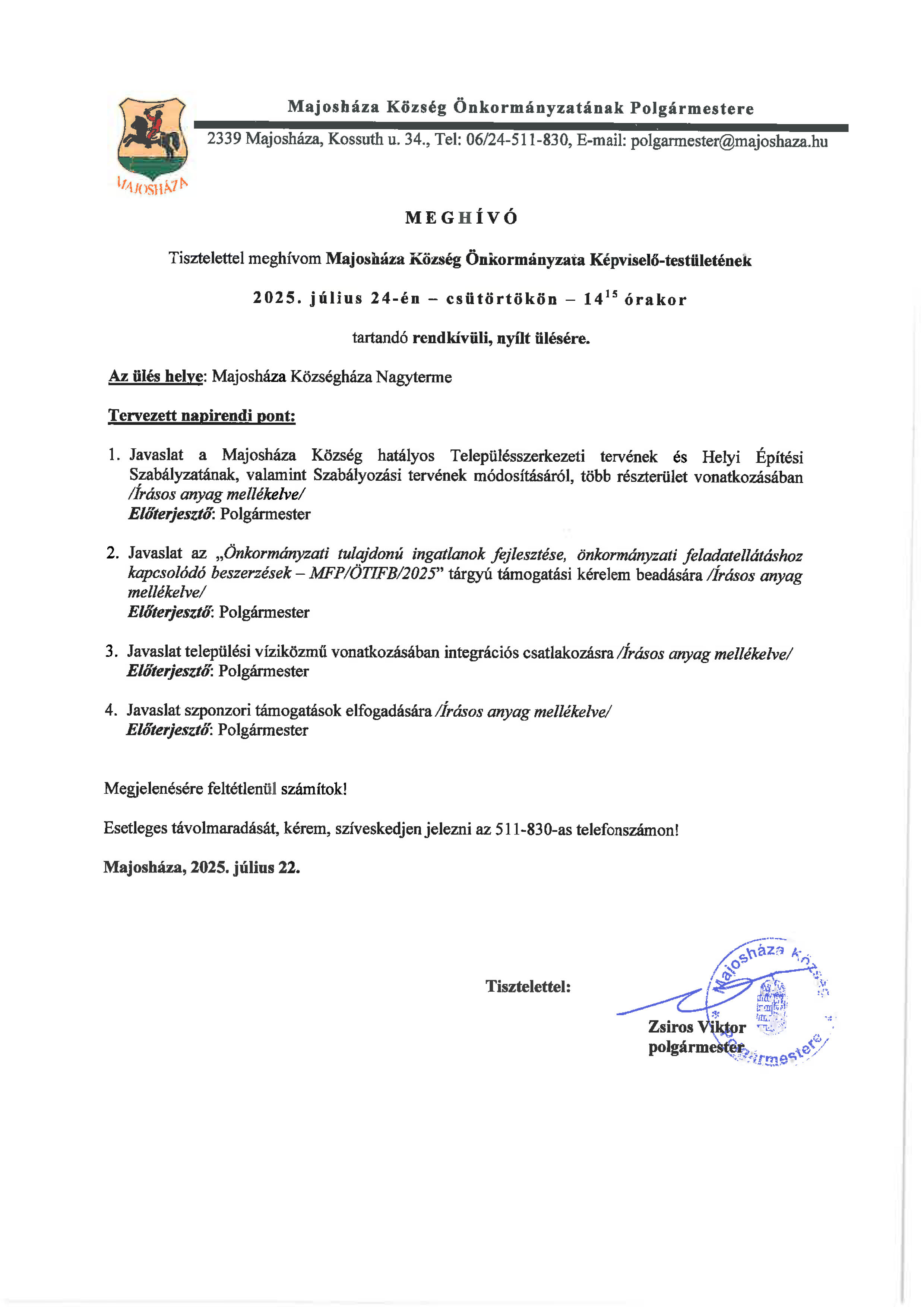 - 1. napirendi javasiat a Majosháza Község hatáiyos Településszerkezeti tervének és Helyi Építési Szabályzatának, valamint Szabályozási tervének módosításáról, több részterület vonatkozásában