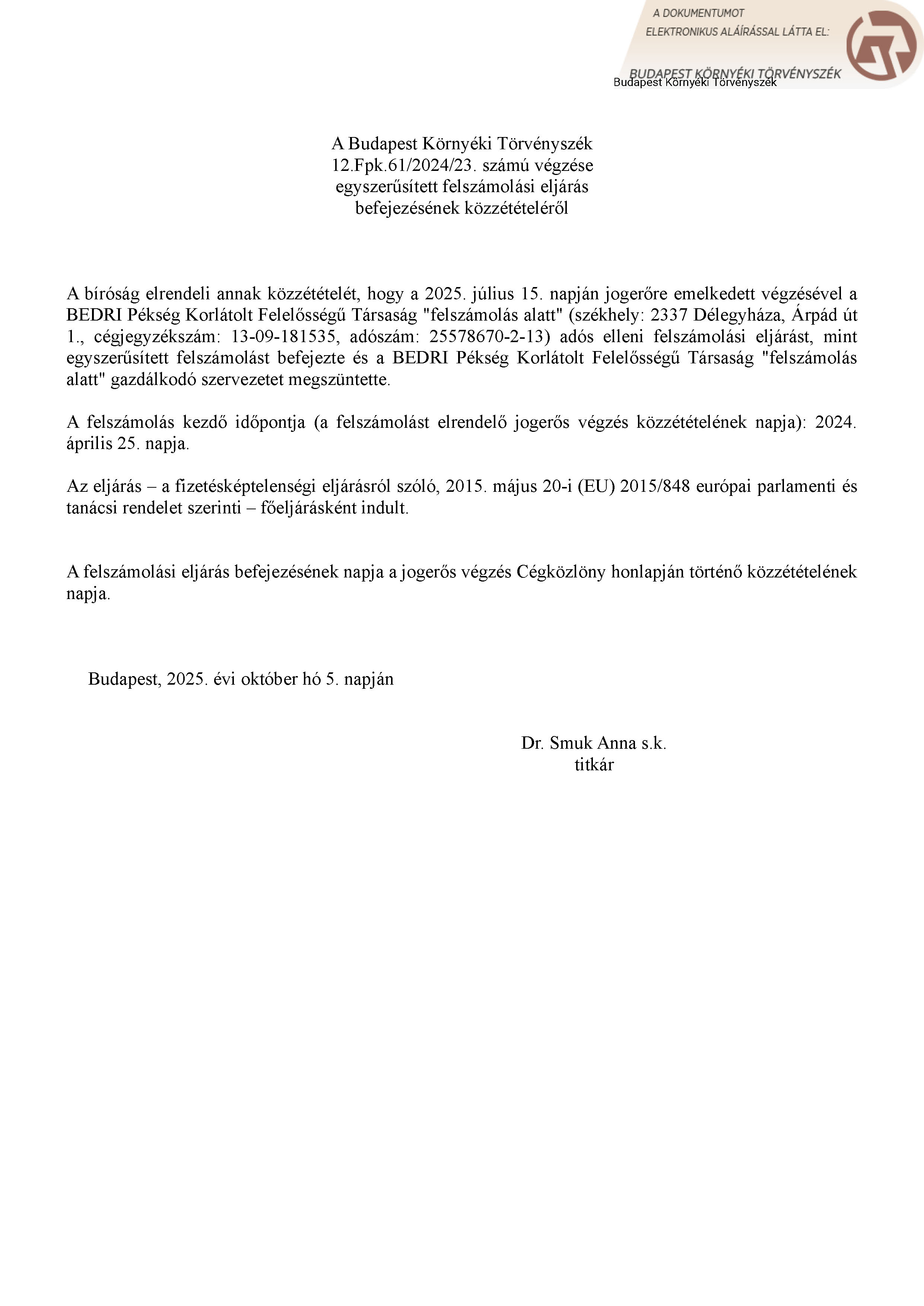 MJH-224-15-2025 hirdetmény egyszerűsített felszámolási eljárás befejezésének közzétételéről